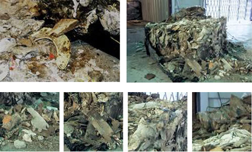 - ・日本からの調査団が検分したのはコンテナ前面部分と思われるが、このチェック済みの梱包には、大人用紙おむつ(ブルーの)やプラステイック容器、紙くず(伝票のようなもの)が入っていた。ちなみに、コンテナ後方部分には、建築廃棄物が多い。