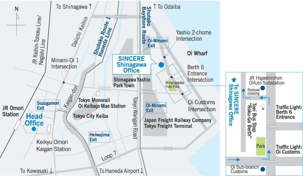 ※Car navigation systems do not provide directions to the entrance of the Shinagawa Office. If you need detailed directions to the entrance of the office, please use the navigation function of Google Maps or see the area map on our website.