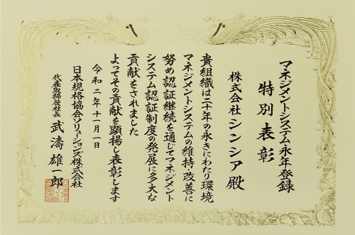 2020年11月1日、ISOマネジメントシステム認証継続20年の節目に際し、日本規格協会ソリューションズ株式会社より表彰されました。