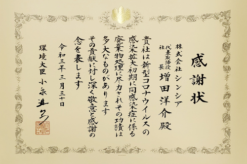 2021年3月30日、環境大臣より、新型コロナウイルス感染拡大初期に発生した感染性廃棄物の処理や、感染拡大期における円滑で確実な廃棄物処理の継続について当社の功績が認められ、感謝状を頂きました。