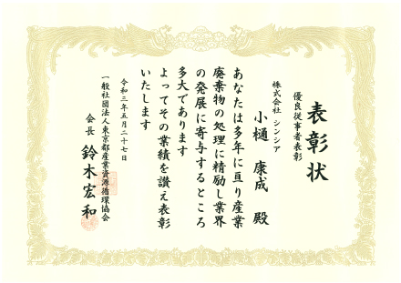2021年5月27日、一般社団法人 東京都産業資源循環協会優良従事者として品川R・Cセンター管理部長の小樋康成が表彰されました。