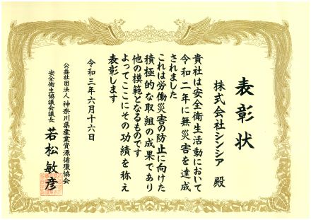 2021年6月16日、公益社団法人神奈川県産業資源循環協会から、当会の表彰規定に基づき、シンシア横浜事業所が無災害事業所として、9年連続表彰されました。