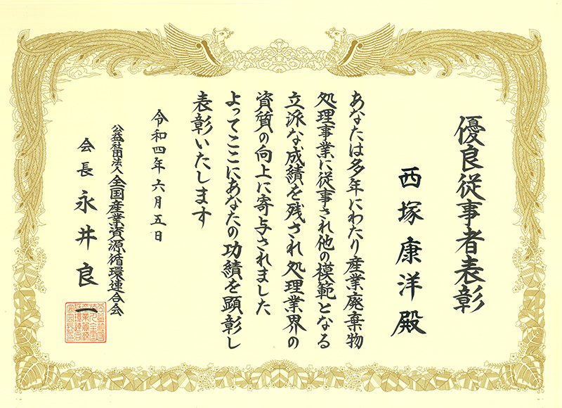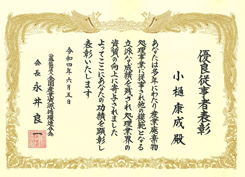 2022年6月5日、公益社団法人全国産業資源循環連合会より、優良従事者として品川R・Cセンター管理部長 小樋康成、施設技術本部 施設管理部長 西塚康洋が表彰されました。