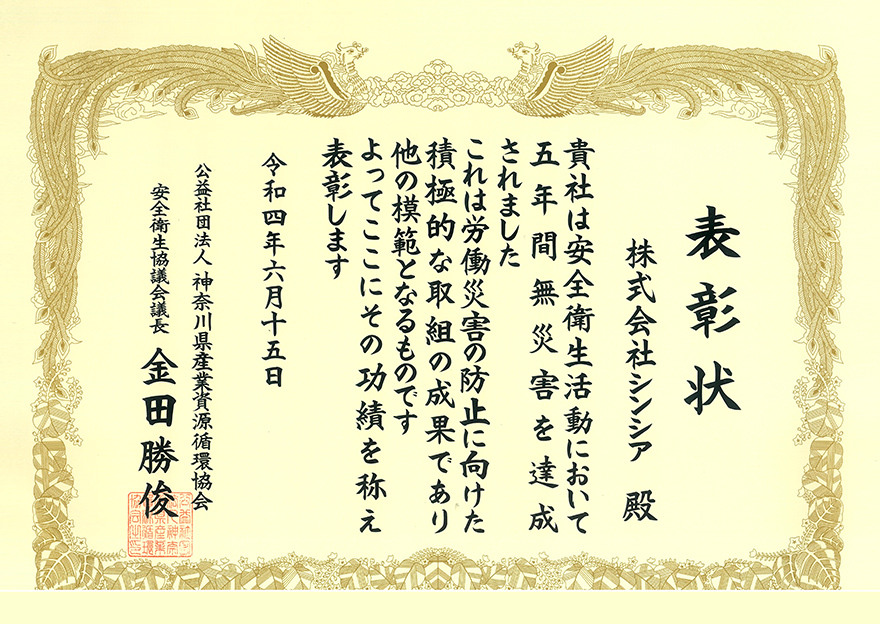 2022年6月15日、公益社団法人神奈川県産業資源循環協会から、当会の表彰規定に基づき、シンシア横浜事業所が無災害事業所として、10年連続表彰されました。
