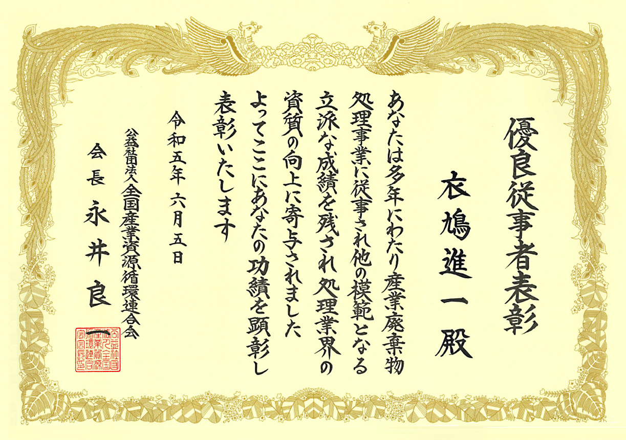 2023年6月5日、公益社団法人全国産業資源循環連合会より、優良従事者として横浜R・Cセンター運用部運用課長衣鳩進一が表彰されました。