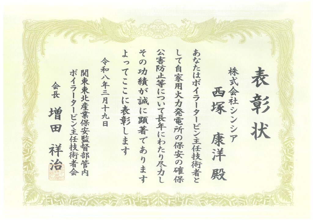 2026年3月19日、関東東北産業保安監督部管内ボイラータービン主任技術者会より、施設技術本部部長の西塚康洋がボイラータービン主任技術者功績者として認められ、表彰されました。